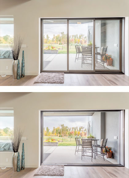 Standard sliding patio doors open by sliding along horizontal tracks at the head and sill.